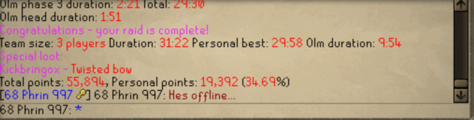 68 Phrin 997 hosted a raid in WDR's lfr-cox-learner channel. KyrasKnight and Kickbringox joined through the lfr post. Kickbringox received a twisted bow drop and then disappeared without splitting. His username was not set in WDR so they weren't able to contact him.