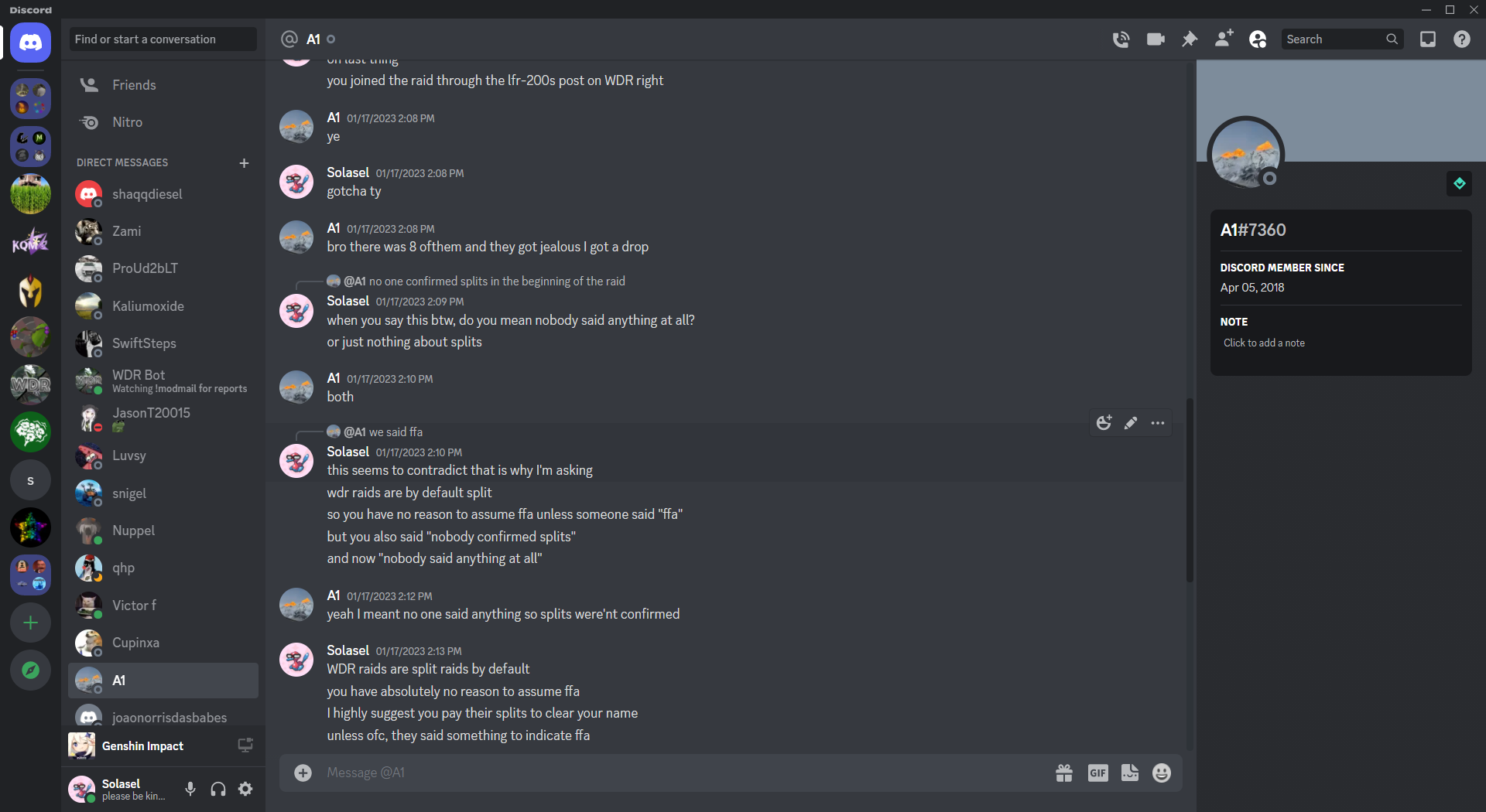 Accused rejoined a day later, and thus I was able to contact him and have a conversation, which is included in evidence. He admitted to taking the chaps because he "thought it was FFA". WDR staff held a vote and unanimously agreed that it was a split raid, so he was liable to split. He was given 24 hours to repay, but 1h afterwards left the server and refused any further contact. This was the final message with the accused.