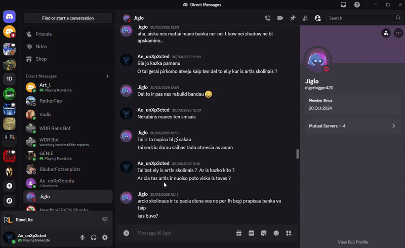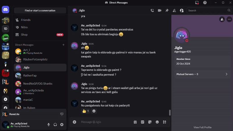 after the trade strange things started based on his story: "he got trade scammed in GE from scam bots for 2b (shadow, my ely and something else)", then got drunk and shared his account details with his other "friend" and he "scammed other 2.2b from his bank". After these stories in the following days he continued texting me that he will get my items back, but stories changed indicating that he is trying to prolong my waiting time and never mentioning that he stole the items, - just he will get back them to me, but reasons why not now were getting stranger and response times were getting longer and longer. I need to mention that all conversations hapend in native Lithuanian, he never admits that he scammed me but neither admits that he will return my items, unfortunately I do not have evidance of trade screenshot, but ther'es a'lot of of conversations between me and him (in Lithuanian) where I'm asking him to return items, but he continues talking but never admits of scam. What you should notice: he doesn't say that he not stole, he wears good gear of 100m but rejects to give something as a partial pay back, not innocent person should defend himself - in this case he just avoids confrontation. I think you had many cases like this and you could guide me what evidences I could provide. Also he never provided any screenshots in DC where it would be possible to link his account to DC - Only that I posted a warning in our FB group he provided me a screnshot of that post with some comments and context of conversation it would be possible to see the connection. THIS IS SECOND TIME I REPORT this issue and i got new evidence: he tried to scam one community member and he contacted me, I have screen recordings where he in his DC treams with Nerd Sick account, there is screens where he talks in DC about my ELY, also thers screens from my DC where he talks about how he tries “return” my items. Also there is screens where he chats with my osrs account as proof that we were friends in game I think there is enought evidences to link his osrs acc to DC and to use DC conversation as evidence that he got my items