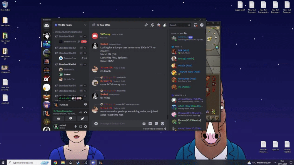 'Sarked' hosted a duo raid in the We Do Raids' discord server under the #lfr-toa-300s channel, where drops are split by default. 'Sir Loin TM' joined the duo raid and Biz from Tx (at the time) was recruited shortly afterwards making it a trio raid instead. All three users were in a WDR voice channel prior to the scam occurring. The latter then received a Tumeken's shadow drop and proceeded to leave the discord as well as name change, with no intention on splitting.
